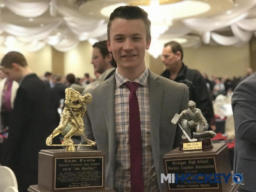 Evola with his Mr. Hockey and top goaltender award in 2018