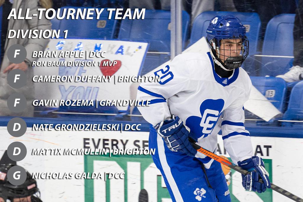Parker Jamieson scored at the halfway mark of the second period to even the game at 1-1. Brian Apple, the eventual Ron Baum Division 1 MVP, scored the go-ahead goal at the 11:52 mark of the middle frame to send DCC into the second intermission with more than enough momentum.